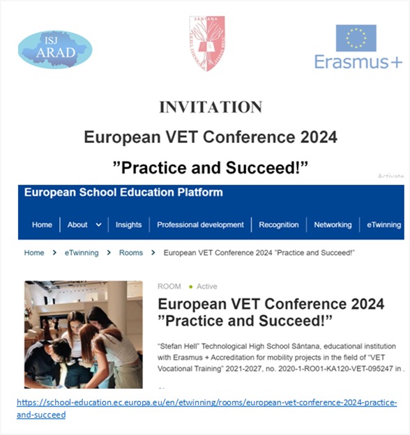 Liceul Tehnologic “Stefan Hell”Sântana, instituție de învățământ cu Acreditare Erasmus+ pentru proiecte de mobilități în domeniul “Formare profesională VET” 2021-2027, nr. 2020-1-RO01-KA120-VET-095247, în colaborare cu Inspectoratul Școlar Județean Arad – compartimentul proiecte educaționale, organizează Conferinţa europeană VET ”Practice and succeed” - ediția a 2-a, care va avea loc în format on line asincron, pe parcursul lunii iulie 2024, pe platforma European School Education Platform