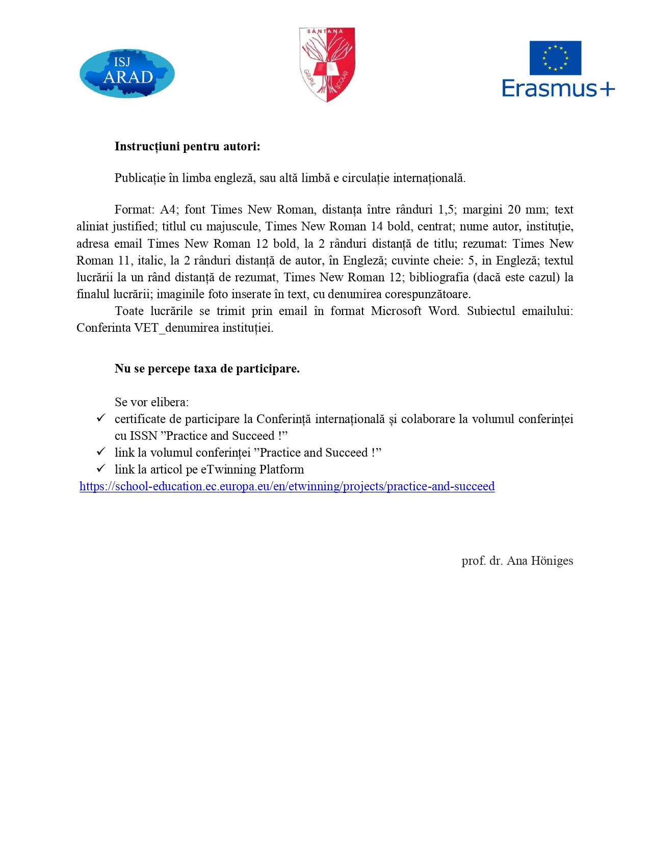 Liceul Tehnologic “Stefan Hell”Sântana, instituție de învățământ cu Acreditare Erasmus+ pentru proiecte de mobilități în domeniul “Formare profesională VET” 2021-2027, nr. 2020-1-RO01-KA120-VET-095247, în colaborare cu Inspectoratul Școlar Județean Arad – compartimentul proiecte educaționale, organizează Conferinţa europeană VET ”Practice and succeed” - ediția a 2-a, care va avea loc în format on line asincron, pe parcursul lunii iulie 2024, pe platforma European School Education Platform