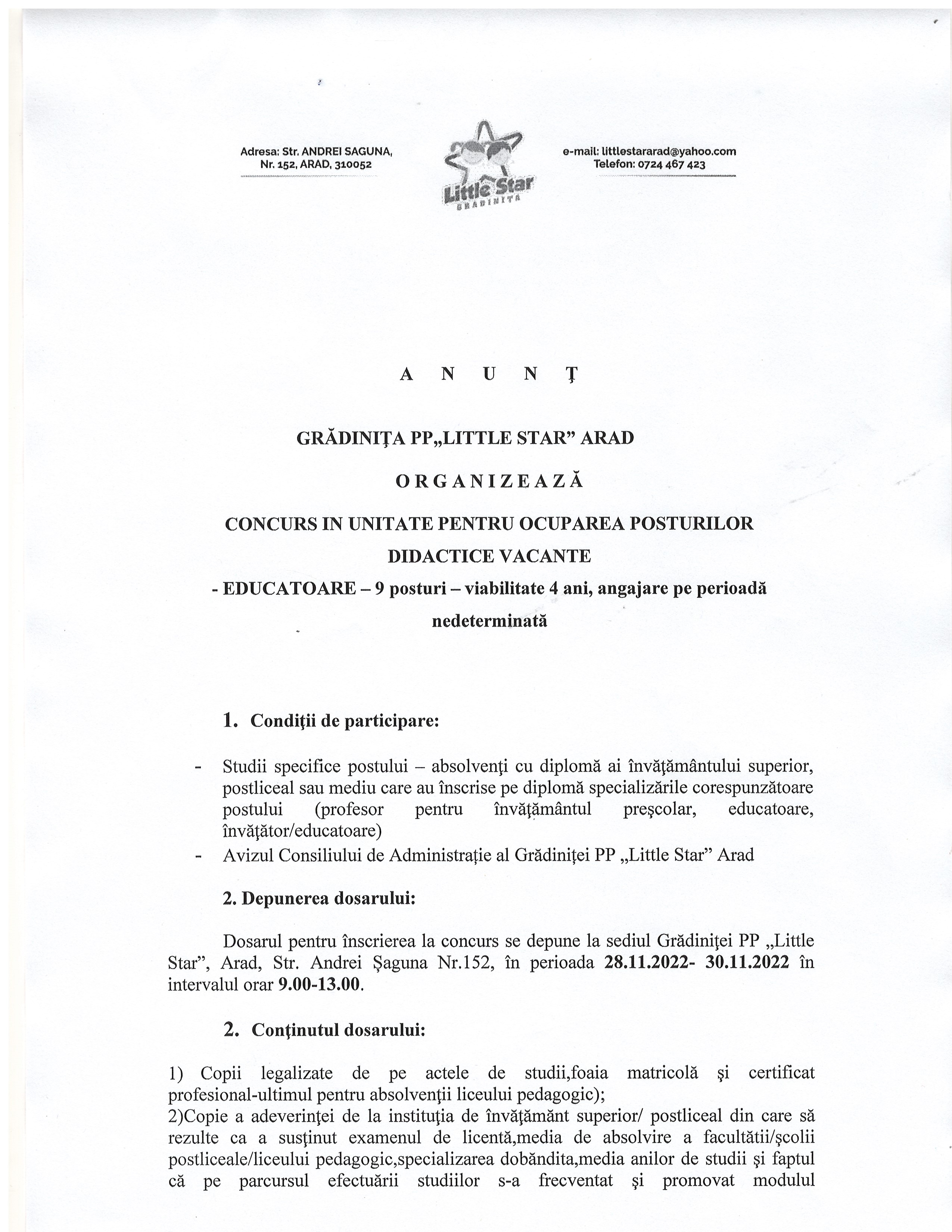 | ANUNT CONCURS GRADINITA P.P. LITTLE STAR ARAD http://www.isjarad.ro/forum/viewtopic.php?f=176&t=46402 |