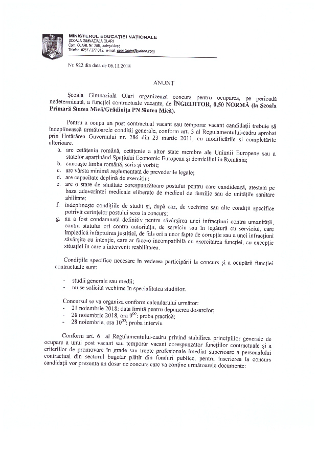 | Anunț concurs post vacant îngrijitor http://www.isjarad.ro/forum/viewtopic.php?f=266&t=37373 |