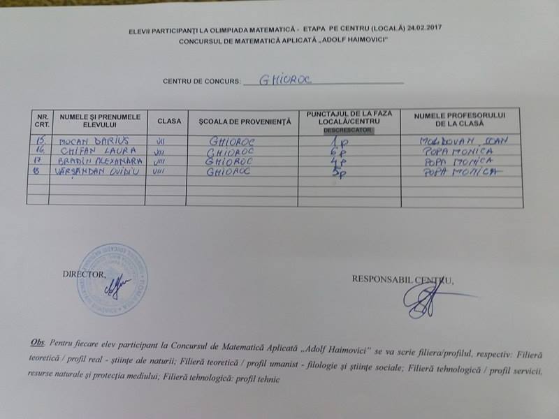 | Subiectul mesajului: | REZULTATE OLIMPIADĂ MATEMATICĂ+HAIMOVICI-JUDEŢUL ARAD: T 01.03.2017 |