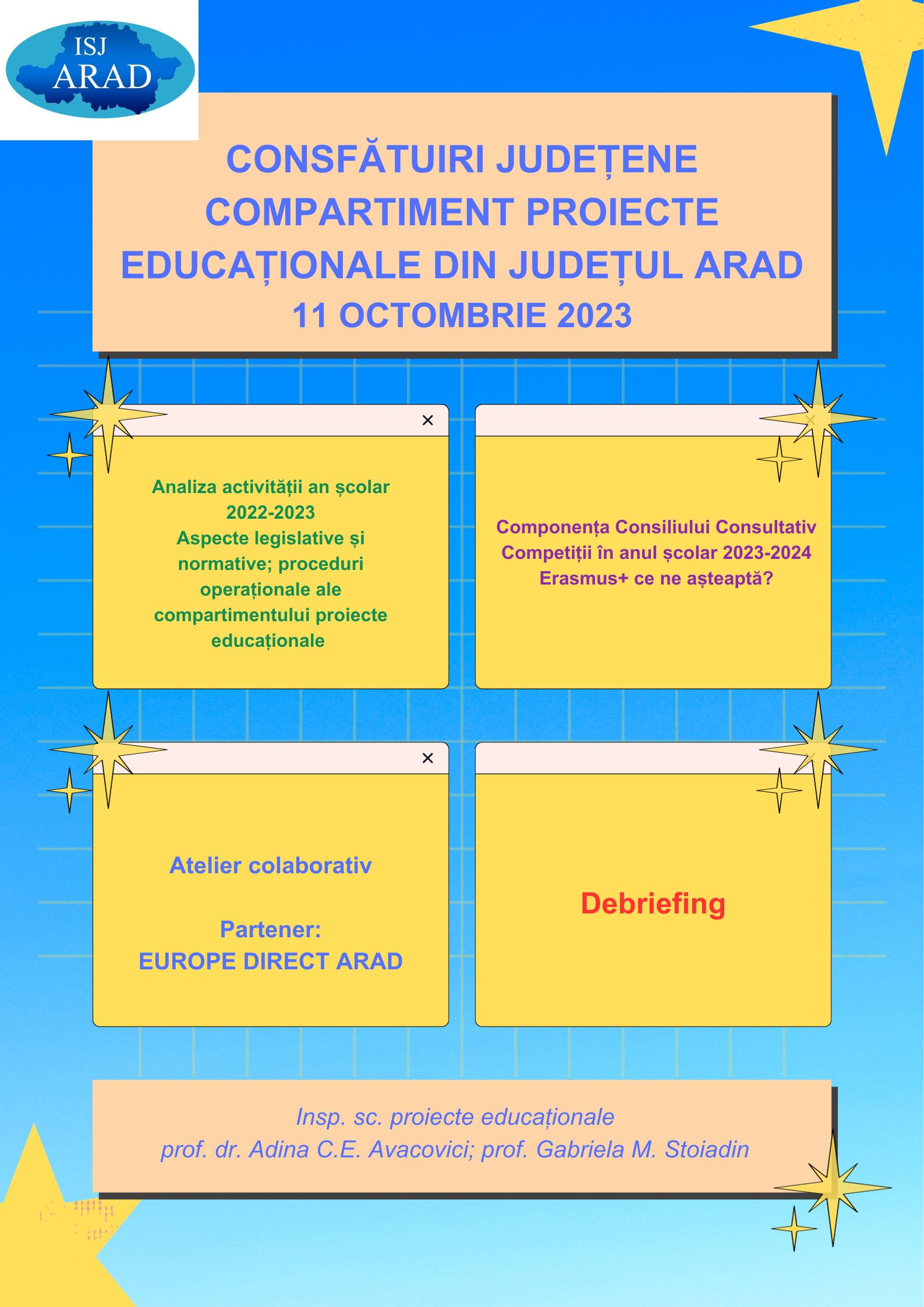 Miercuri 11 octombrie 2023, începând cu ora 14,30 se vor desfășura în sala de ședințe ISJ Arad consfătuirile județene ale compartimentului proiecte educaționale.