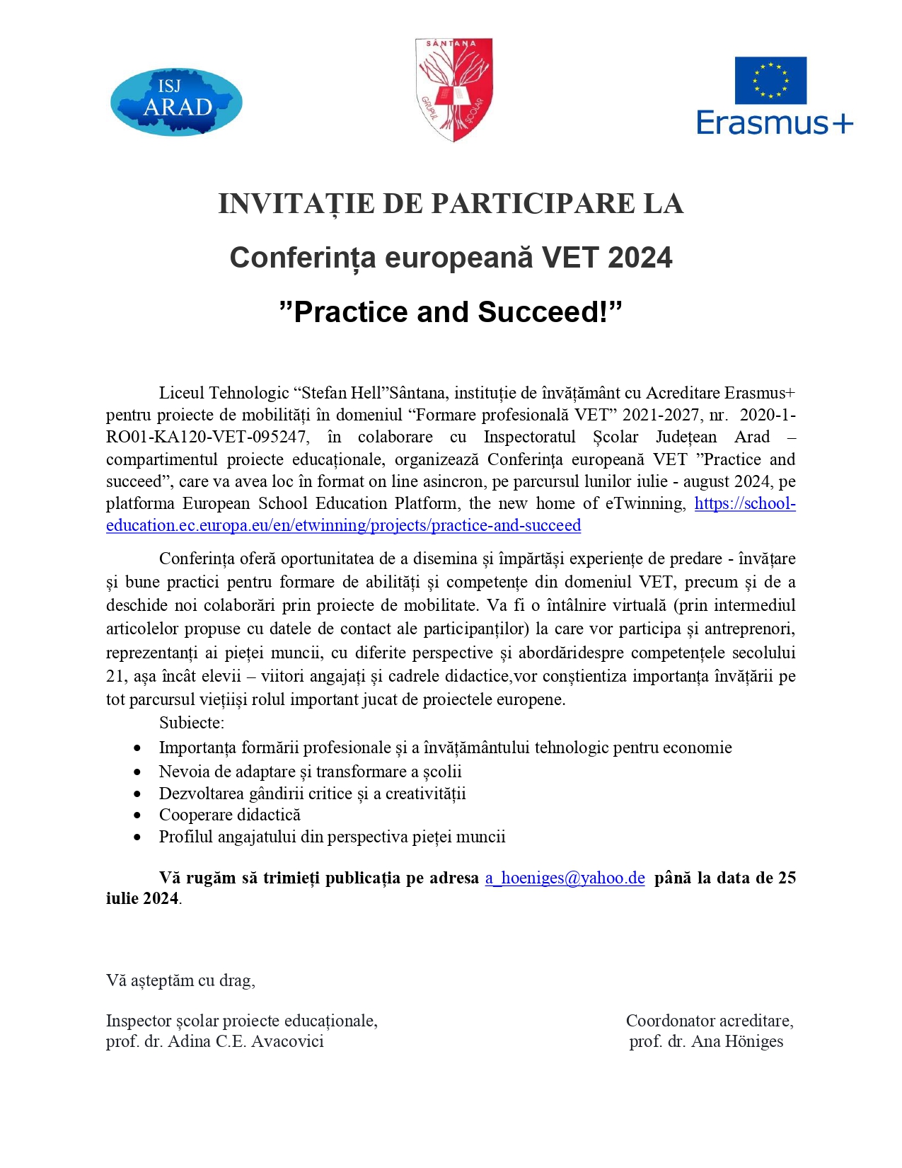 Liceul Tehnologic “Stefan Hell”Sântana, instituție de învățământ cu Acreditare Erasmus+ pentru proiecte de mobilități în domeniul “Formare profesională VET” 2021-2027, nr. 2020-1-RO01-KA120-VET-095247, în colaborare cu Inspectoratul Școlar Județean Arad – compartimentul proiecte educaționale, organizează Conferinţa europeană VET ”Practice and succeed” - ediția a 2-a, care va avea loc în format on line asincron, pe parcursul lunii iulie 2024, pe platforma European School Education Platform