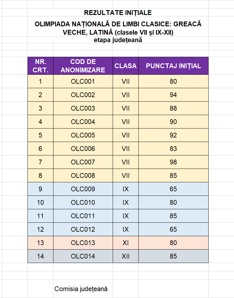 Atașăm rezultatele anonimizate la OLIMPIADA NAȚIONALĂ DE LIMBI CLASICE: GREACĂ VECHE, LATINĂ, ETAPA JUDEȚEANĂ, 2025.